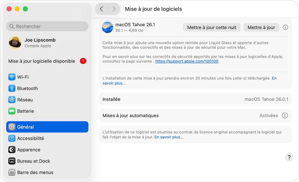 le menu Apple, puis Réglages Système > Général > Mise à jour logicielle.